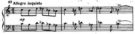 Краткое возвращение к лирическому, образу побочной партии в репризе (Andantino) уже воспринимается как уходящее в далекое прошлое воспоминание, как мимолетный отдых среди яростного урагана страшной схватки. Ведь главная партия здесь отсутствует вовсе, а побочная дана в несколько сокращенном изложении. Но зато в последующей коде (Allegro inquieto) драматургически утверждается возбужденный образ тревоги. Главная тема, появившись внезапно, развертывается дерзко и властно; нервы обнажены, чувства и мысли обострены до предела.