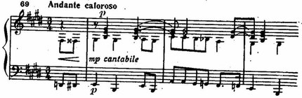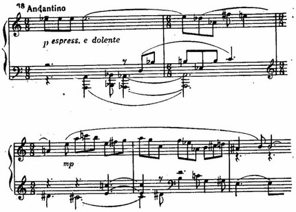 В то же время в пространном и контрастирующем среднем разделе (Росо piu animato) трехчастной формы Andante заметно ощущаются традиции фортепианного письма Мусоргского (например, типично колокольные эпизоды, особенно на ремарке un росо agitato). При всем богатстве элементов красочности в фактуре этого раздела второй части и в нем поначалу господствует песенность. Правда, в дальнейшем (Piu largamente) использованы приемы разработочного развития на широком симфоническом дыхании, с ладотональной неустойчивостью и относительно большими кульминационными участками. Такая необычная для медленных частей патетическая динамизация вызывает необходимость соответствующего архитектонического равновесия — раздела с постепенным успокоением, «затуханием»; и композитор дает этот участок формы, участок, вводящий в краткую репризу-коду (Tempo I), где музыка замирает, сходит на нет. Эмоциональный «прилив» уравновешивается эмоциональным «отливом».