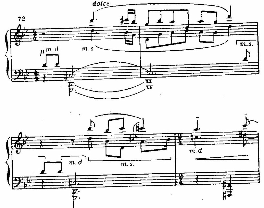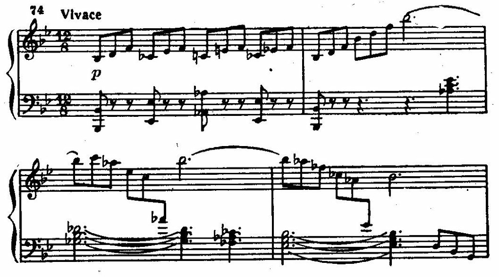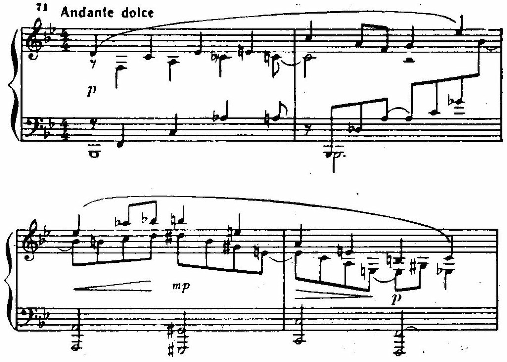 Опять поражает сопоставление тональностей на расстоянии полутона: си-бемоль мажор и си мажор. Приходится вновь и вновь убеждаться, что интервалы тритона и полутона становятся типичными для тональных соотношений в музыке композитора; они привлекают его своей остротой, драматической потенцией.