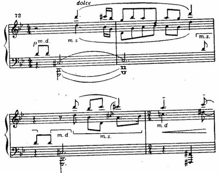 Связующая партия (Росо piu animato) многопланова. В начале (семь тактов) она образно связана с главной. Но затем (pianissimo, legato) новый характер движение создает контрастирующее настроение (хотя в левой руке используются «огрубленные» интонации той же главной партии). Здесь и подчеркнутая красочность, и некоторая таинственность. Впоследствии на этом материале связующей партии возникает довольно большой отдел разработки. Появится он и в коде. И это вполне логично с точки зрения формы: ведь после углубленно-раздумчивой лирики главной партии связующая (в этом среднем ее отделе) воспринимается как поворот к более взволнованной экспрессии, динамичной устремленности.