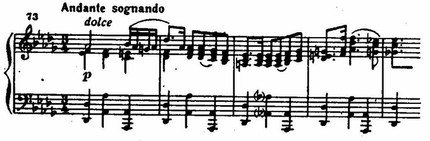 В ее метроритмическом рисунке нетрудно обнаружить также черты медленного полонеза. Таким образом, связь с излюбленными Прокофьевым (в балетах) традиционными танцами XVIII века несомненна (вспомним церемонный приезд гостей на бал из «Ромео и Джульетты» или гавот из «Золушки») (При сочинении второй части Восьмой сонаты Прокофьев использовал музыку к спектаклю «Евгений Онегин», op. 71 («Бал у Лариных», № 23 по клавиру), дополнив ее a-moll'ной темой.). Но в сонате сценическое движение переключено в мир иллюзорности, пленительной мечты (подобный миру образов Седьмой симфонии и Девятой сонаты). Еще раз убеждаешься, как неуклонно влечет Прокофьева к мягкой и нежной лирике, в родственный и близкий его душе мир Джульетты и Золушки, Наташи и Катерины.