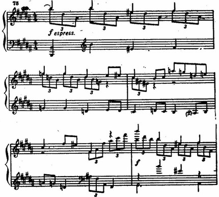 Образ побочной партии контрастирует с образом главной лишь в оттенках; это маршевое движение на фоне акцентированных триолей.