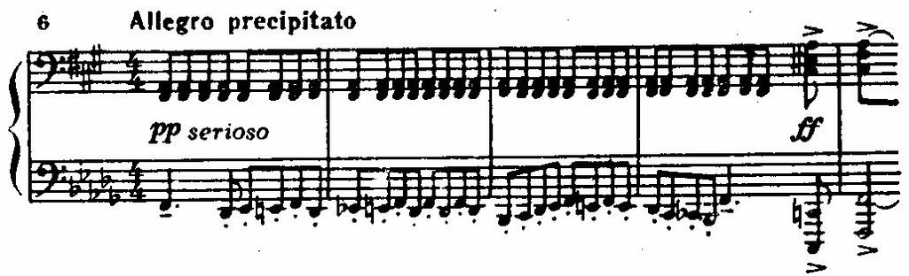 Наиболее проникновенен пятый «Сарказм» (C-dur, Precipitosissimo, 1914). Это подлинно трагическая пьеса, написанная с глубиной, вдохновением и мастерством образного воплощения. Мы уже приводили ее авторскую программу типично гоголевского «смеха сквозь слезы». Впрочем, восприятие ее программности крайне разноречиво («Никакого сарказма в музыке нет. Есть сила и душевное здоровье»,— утверждает А. Орелович в статье «О фортепианной музыке раннего периода творчества С. С. Прокофьева» (сб. «Черты стиля С. Прокофьева», М., 1962, стр. 132).). В основе «Сарказма» — два контрастных образа, два начала, воплощенных в простой трехчастной форме.