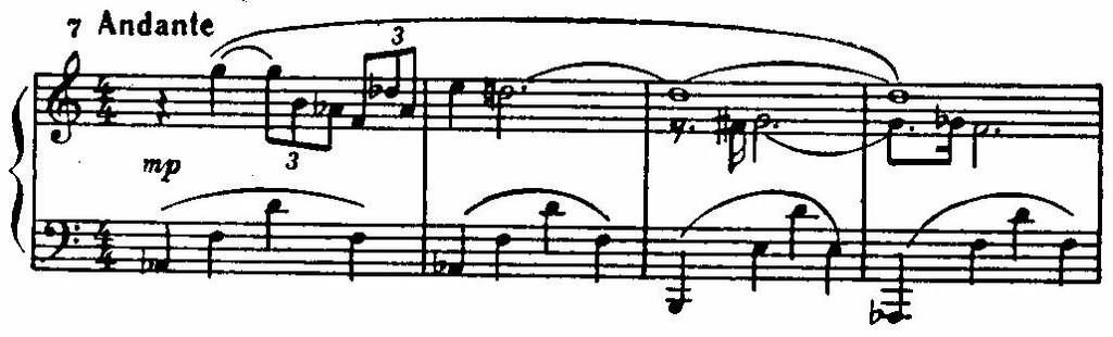 По аналогии с известной «трехъярусной» гармонией скрябинской «Поэмы экстаза» (остов гармонии первых тактов заключительного Maestoso в поэме) Прокофьев также широко использует «синтетическую гармонию» из наслоенных друг на друга основных функций лада, имеющую здесь чисто созерцательную красочную осмысленность.