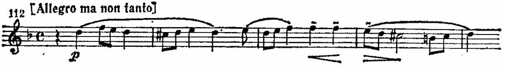Только в заключение экспозиции (Meno mosso, цифра 45) дан еще один вариант той же темы, в котором сохраняются ее основные очертания, но мелодический рисунок становится более мягким и плавным.