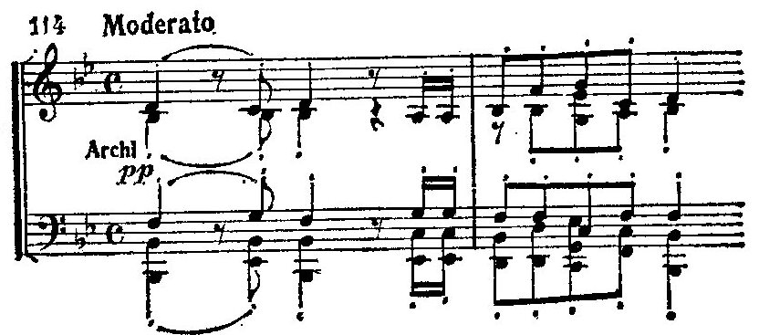 В дальнейшем развитии темы выразительная напряженность ее звучания усиливается благодаря секвенцированию и насыщению мелодики хроматизмами. Достигая своей высшей точки — звука b, мелодия затем спокойно, тремя сокращающимися по диапазону ниспадающими волнами (Заключительное предложение темы построено по принципу «сопоставления с результатом» (2—2—4). Метрическое растяжение третьей волны усиливает впечатление «отлива», постепенно убывающей динамики.), опускается к тонике. Основой ее является, таким образом, минорный гексахорд, что подчеркивает ее сходство со старинными русскими напевами.