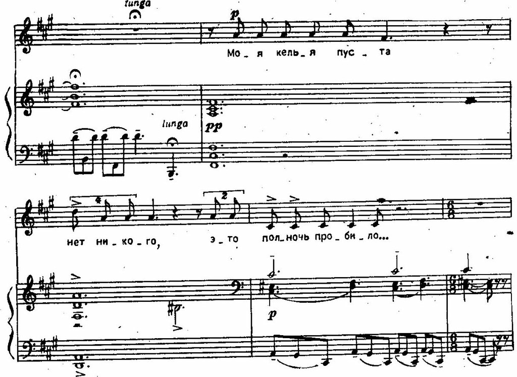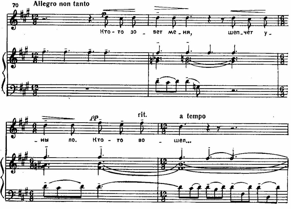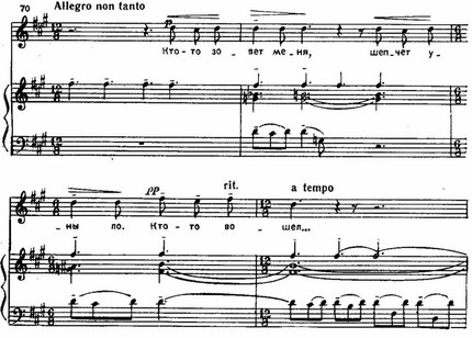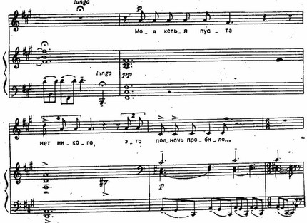 Манера письма в этих последних напоминает цикл «Без солнца» и некоторые из «Песен и плясок смерти» Мусоргского. Таков, например, следующий фрагмент, где фактура фортепианного сопровождения чутко отзывается на все оттенки вокальной декламации, подчеркивая смену настороженного ожидания безнадежностью и унынием. Тонко вплетен в изложение изобразительный момент — бой часов в полночь:
