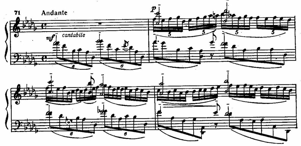 В этой вариации тема полностью проводится в своих первоначальных очертаниях, лишь с небольшими вариантами мелодического рисунка, но в корне меняется все ее освещение. Она звучит в мажоре светло и упоенно, и если у Шопена мелодия образуется только движением верхнего голоса в хоральной аккордовой фактуре, то здесь она выделяется из общего комплекса элементов и приобретает самостоятельное значение. Увеличение ритмических длительностей придает ей характер широкой, протяжной песни. Тяжелая маршевая поступь шопеновской темы заменяется мягким, текучим ритмом неторопливых секстолей, которые «несут» на себе мелодию, плавно парящую в среднем, альтовом регистре. К основному мелодическому голосу присоединяется второй, в высоком регистре, непрерывно имитирующий тему, и между обоими голосами возникает выразительный дуэт. Обращает на себя внимание полиритмия, создаваемая сочетанием квннтолей в фигурациях, оплетающих высокий мелодический голос, с секстолями левой руки. Все это вместе взятое образует типично рахманиновскую густую, но подвижную и «дышащую» музыкальную ткань, в которой каждый элемент живет своей жизнью: