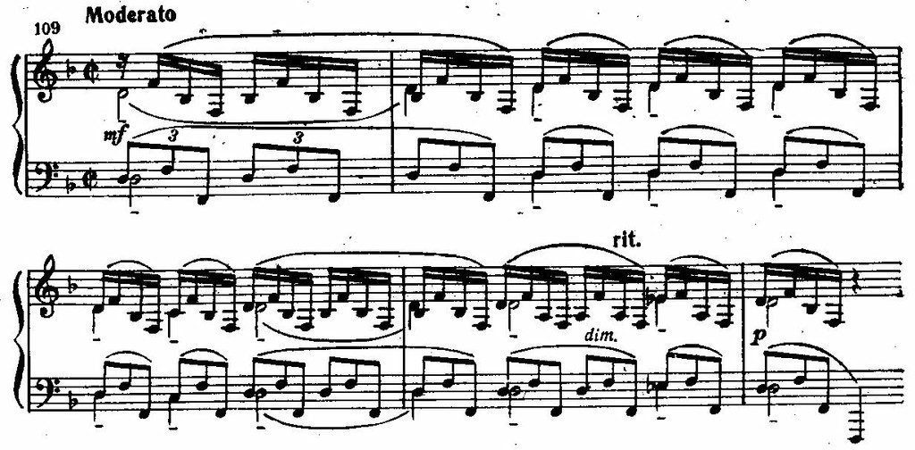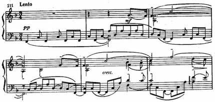 Внезапный бурный и стремительный взлет пассажей шестнадцатыми нотами звучит как попытка вырваться из этого скованного состояния, но порыв оказывается тщетным: движение наталкивается снова на властные, тормозящие аккорды и весь период замыкается начальной квинтовой интонацией.