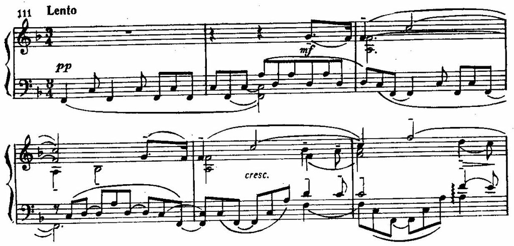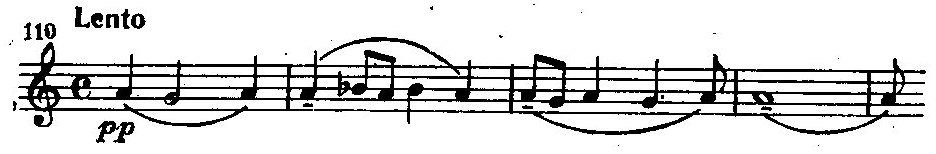 Из трех частей произведения наибольшая цельность отличает вторую – Lento. Она довольно продолжительная, но лишена тематических контрастов. Тематическая ячейка, которая является источником ее музыкального материала, основана на элементах главной темы предшествующей части. Фактура насыщена полифоническими элементами, основанными на секундовой интонации.