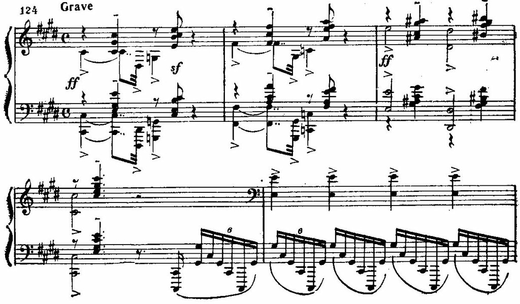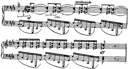 Особую тревожную окраску придают музыке «соскальзывающие» хроматизмы eis — е в приведенном примере, порывистые «скрябинские» ритмы во втором разделе (Tempo I). Вся пьеса выдержана на высочайшем динамическом уровне звучания ff, fff). Непрерывное ритмическое и фактурное нагнетание доводит чувство напряженного ожидания до пределыюго накала.