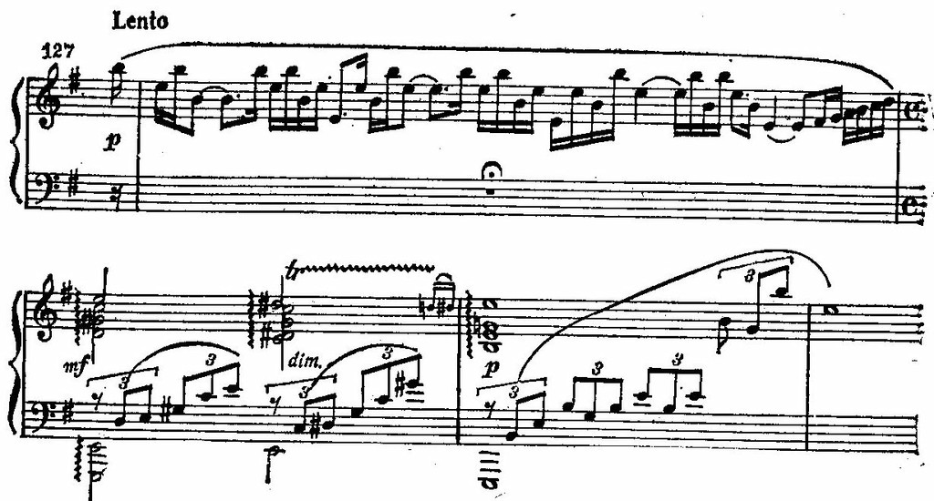 Те же или сходные образные элементы — море, «где крутился вал», чернеющие тучи — в совершенно ином плане представлены в романсе «Ветер перелетный» на слова К. Д. Бальмонта. Тонкая импрессионистическая игра светотени, зыбкость, изменчивость оттенков, свойственные поэтическому тексту, замечательно переданы Рахманиновым в музыке романса. Неподвижность, застылость общего фона, создаваемая плавно колышущимся остинатным ритмом сопровождения и медленным смещением основных гармонических устоев, соединяется с детальной красочно-изобразительной нюансировкой. Звукоизобразительное значение свойственно и некоторым оборотам вокальной мелодии. Таков, например, «парящий» волнистый мелодический рисунок на словах «ветер перелетный зыбью пробежал» (Посвятив этот романс Собинову, Рахманинов, вероятно, рассчитывал на его легкий, светлый по тембру голос. Собинову посвящен и ряд других романсов этой серии, в том числе «Арион», «Какое счастье».). «Соскальзывающие» хроматизмы у фортепиано в последующих тактах напоминают отмеченный выше гармонический оборот из этюда-картины cis-moll, но здесь благодаря приглушенной динамике и легкости фактуры возникает образ не грозно полыхающих зарниц, а тихого, еле заметного мерцания:
