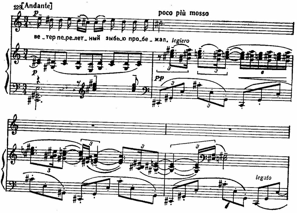 Партии голоса и фортепиано образуют два самостоятельно развивающихся плана, иногда сближающихся и перекрещивающихся, иногда, наоборот, отдаляющихся друг от друга. Так, в последнем такте между поднимающейся в высокий регистр вокальной мелодией и плавно опускающейся вниз линией фортепиано возникает своеобразная «воздушная пустота». Характерно «запаздывающее» окончание голоса, в котором еще продолжается движение после того, как у фортепиано наступает остановка.