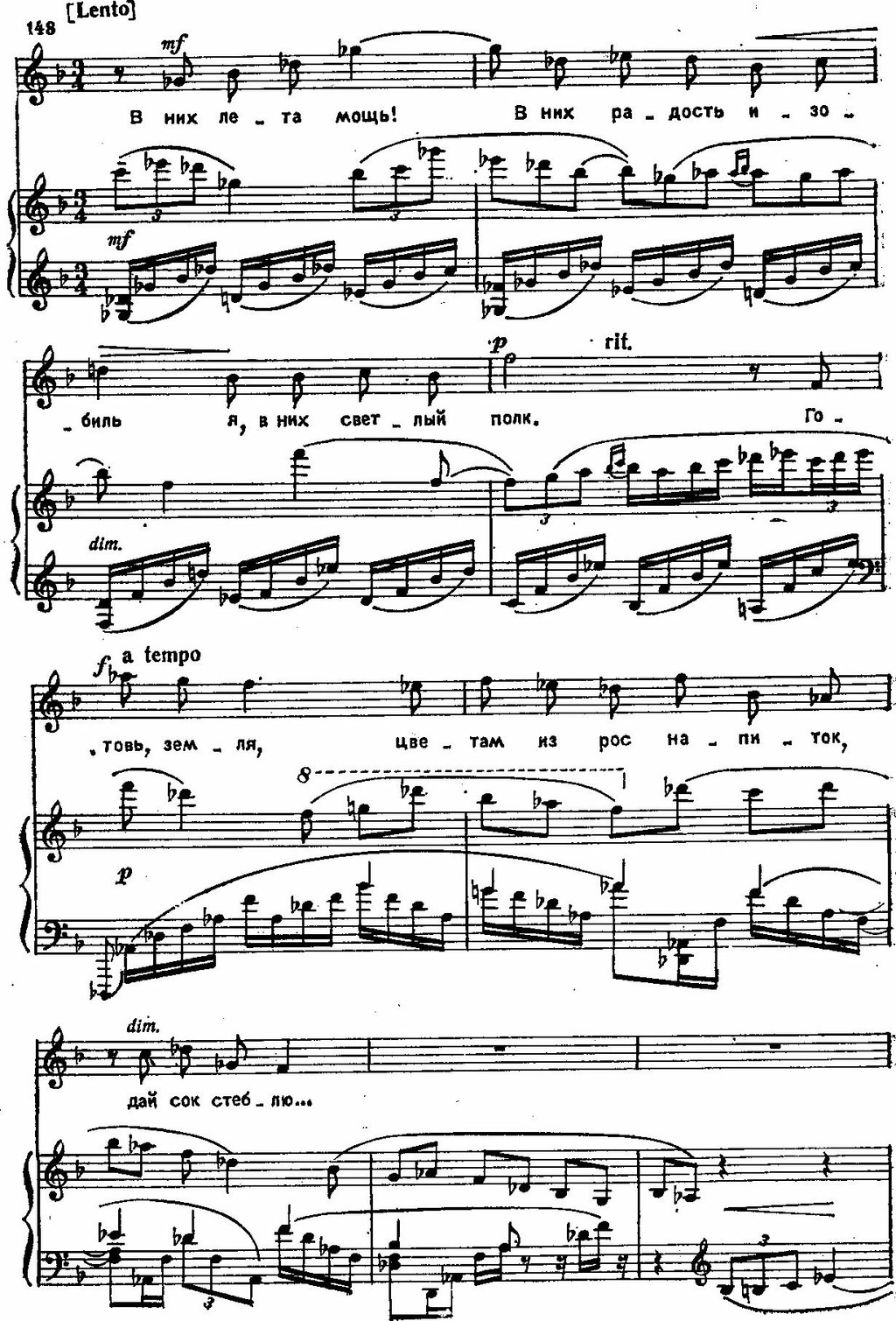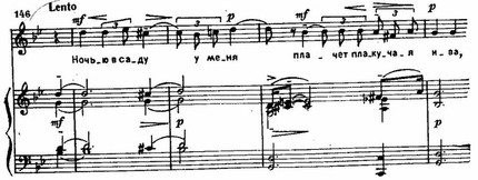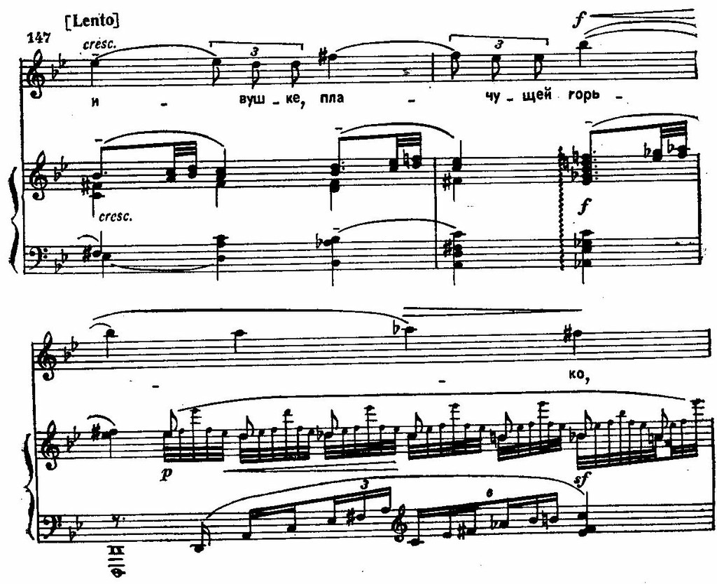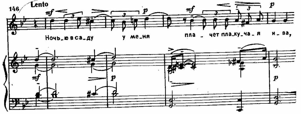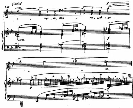 Те же интонационные элементы становятся основой для построения драматической кульминации во второй половине романса, на словах «ивушке, плачущей горько». Композитор объединяет и концентрирует здесь целую группу средств — мелодических, гармонических, фактурно-динамических — для того чтобы с наибольшей силой подчеркнуть и выделить «ударное» значение этих слов, хотя это и приводит к известному нарушению стройности и плавной текучести поэтического текста: