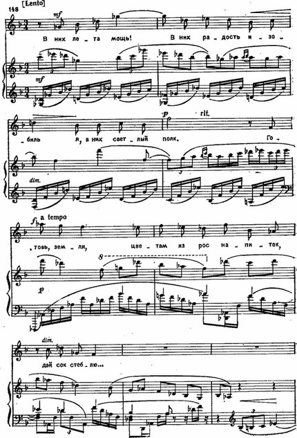 Сквозь этот звенящий фон все время пробивается упорно повторяемый акцентированный звук, меняющий свою высоту и гармоническую окраску подобно влекущему, но неуловимому зову. Страстный, настойчивый клич «Ау!», отдающийся эхом в партии фортепиано, остается безответным. Он словно повисает в воздухе и сливается с наполняющим природу звоном. Романс оканчивается неустойчивой вопросительной интонацией на неразрешенном малом септаккорде и внезапным угасанием звучности в последних двух тактах.