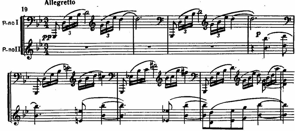 Впечатление идиллического музыкального пейзажа создает первая тема, вращающаяся вокруг терцового звука тонического трезвучия. Она обаятельна, но в ней нет экспрессии, эмоционального накала. Излагается она в октаву у второго фортепиано, в то время как в партии первого звучат триольные мотивы, напоминающие всплески воды. В среднем разделе появляется тема песенного склада. Особую выразительность придают ей альтерированные ступени, а смена минора одноименным мажором просветляет ее колорит. Мелодия излагается в регистре, соответствующем диапазону тенора, что согласуется с жанровой природой баркаролы (песня гондольера). В коде появляется минорный вариант темы среднего раздела, звучащий в нюансе ppp. Очень выразителен мелодический ход на интервал уменьшенной кварты, прежде возникавший в фигурациях.
