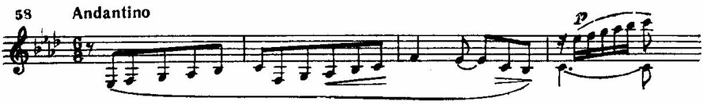 В дальнейшем из приведенной темы вычленяются отдельные элементы, приобретающие самостоятельное значение. Так, первый поступенно восходящий мотив звучит почти непрестанно в различных вариантах, то выдвигаясь на первый план, то превращаясь в сопровождающую фигурацию. Иногда при этом разные его ритмические варианты сопоставляются одновременно.