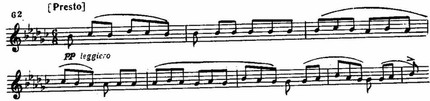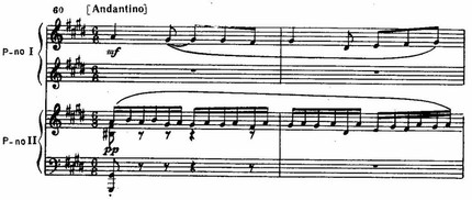 Побочная партия интересна своей ясно выраженной ориентальной окраской, напоминающей образы стремительно огненных восточных плясок в произведениях композиторов «Могучей кучки». Самый характер ее изложения близок к «Исламею» Балакирева: