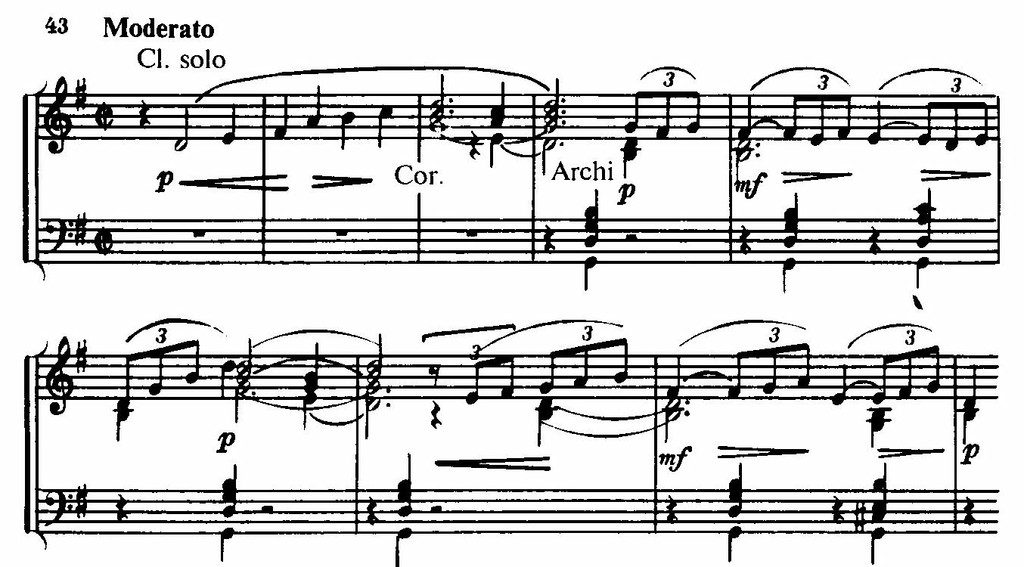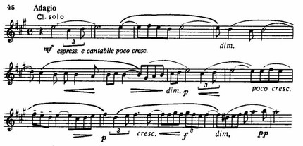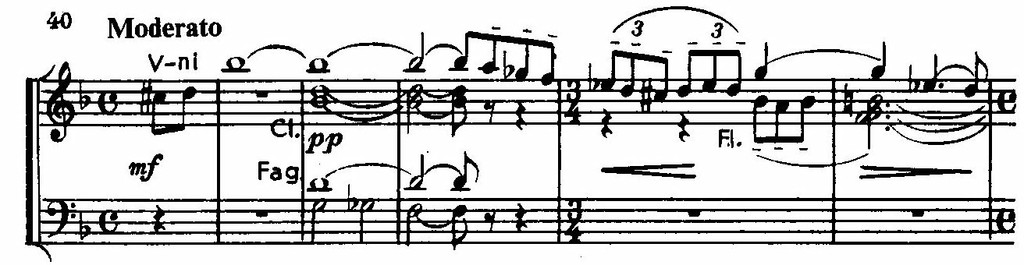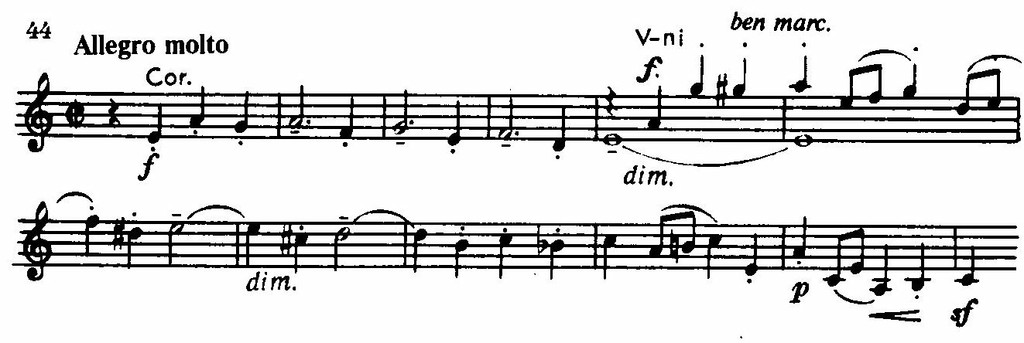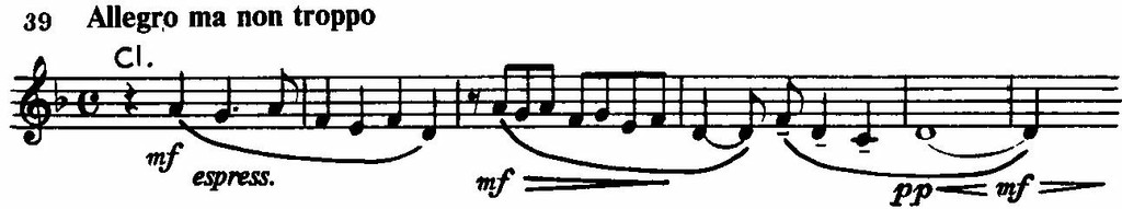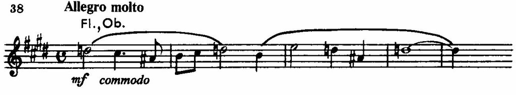 На ней построено необычное по своей длительности медлительно развертывающееся вступление к первой части. Тот же оборот лежит в основе более подвижной, распевной темы главной партии, так же, однако, не свободной от налета скорбной меланхолической задумчивости. Ей контрастирует и одновременно интонационно связана с ней необыкновенно изящная по изложению светлая поэтичная тема побочной партии, состоящая из двух элементов: краткого мотива гобоя и кларнетов типа весенних «кличей», «зазываний» и ответной фразы струнных.