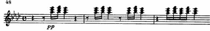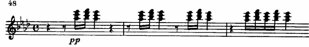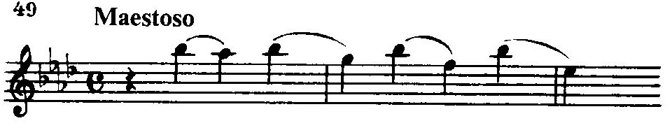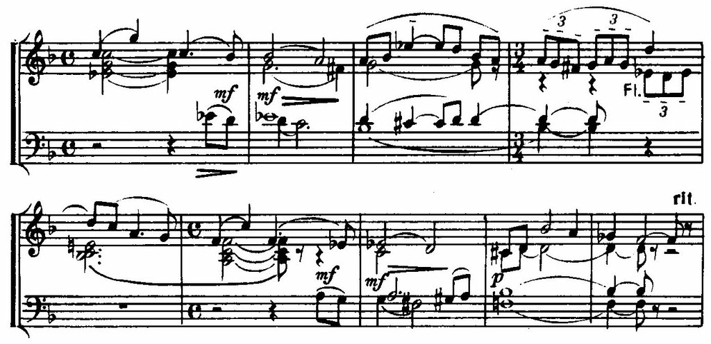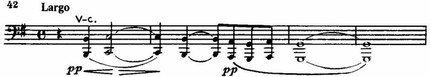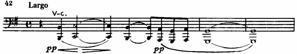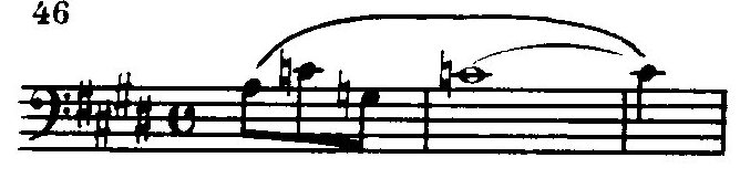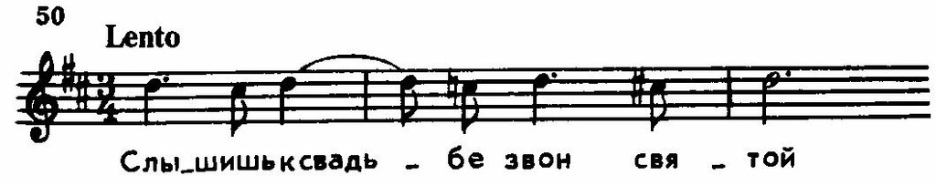 В ее строении (краткое восхождение к вершине, а затем длительное «изживание» чувства в постепенном извилистом нисходящем движении) мы находим уже ярко выраженные индивидуальные черты рахманиновской лирической мелодики.