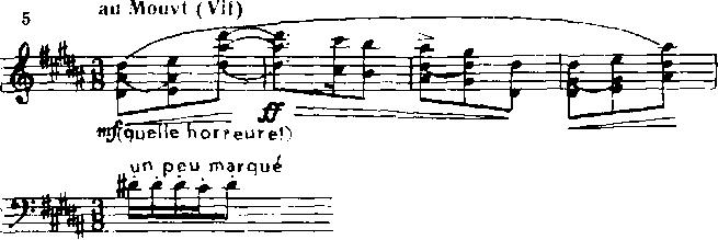Экспозиция пьесы складывается из двух элементов: первый, вырастающий из основной интонации, под которую сам композитор подтекстовал слова «quelle horreur!» («какой ужас!»), и второй, также краткий, полный затаенной тревожности, несущий в себе элементы целотонности: