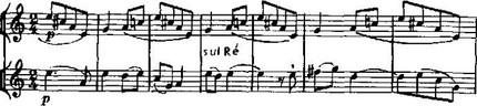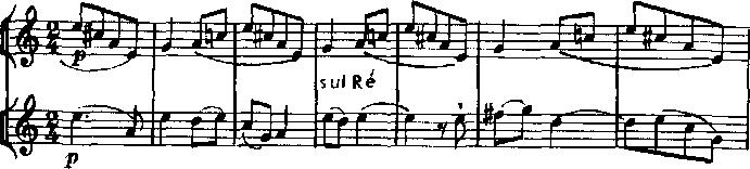 Это зерно простейшего политонального построения (сочетание одноименных мажора и минора), а также и одна из типичных форм остинато, которое является важной составной частью целого, хотя и несет явно выраженную функцию сопровождения. Известно, однако, что в произведениях композиторов-импрессионистов сопровождение нередко выступает на первый план, как это отмечает Альшванг в своем анализе первого «Ноктюрна» Дебюсси. Он находит в теме элементы цепного лада. Музыка Сонаты действительно своеобразна, как видно уже в начальном эпизоде: