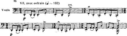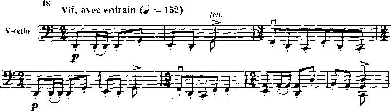 Ритмика первой части темы напоминает о стихии баскского танца, впрочем, без всякой фольклорности. В музыке — торжество чистой линеарности, подчиненной строгим законам композиторской логики. В финале есть краткие реминисценции из предыдущих частей. Средний эпизод (виолончель Solo) характерен в своем четком построении, при повторении (у скрипки) усложнен хроматическими подголосками. В репризе утверждается подчеркнутая размеренность движения, нарастание звучности эффектно завершает цикл.