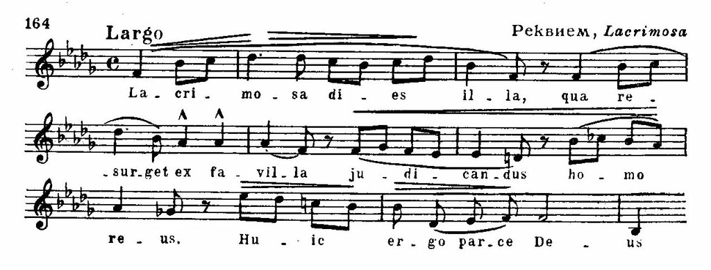 Он обращается к традиционным формам католической заупокойной обедни, но насыщает их новым содержанием. Круг музыкальных образов Реквиема близок к «Аиде». Здесь находят воплощение та же мужественная героика, гневный протест, глубокое страдание, просветленный лиризм и страстная мечта о счастье. Родственны и приемы музыкальной разработки, придающие Реквиему черты оперной выразительности (Характерно, что, за исключением премьеры, состоявшейся в 1874 году, Реквием Верди при жизни композитора давался не в церкви, а в театральных и концертных залах.). Многие же его мелодии звучат как задушевные народные напевы, примером чему может служить Lacrimosa: