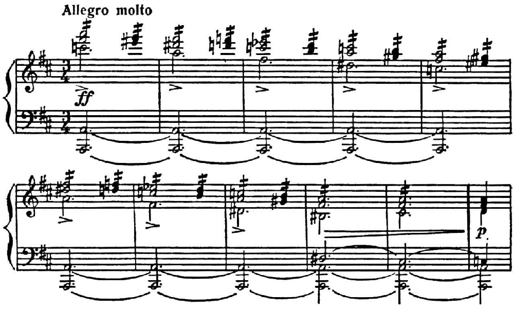 Ранее гамма тон-полутон применялась в западно-европейской музыке, напр. в фортепианных сочинениях Ф. Листа (Этюд Des-dur; «Этюды высшего мастерства»: No 5 — «Блуждающие огни», No 6 — «Видение» и др.), Ф. Шопена (1-я баллада g-moll).