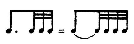 Ритмич. впечатление может быть создано композицией в целом благодаря смене напряжения (восходящей фазы, арсиса, завязки) разрешением (нисходящей фазой, тезисом, развязкой) и делению цезурами или паузами на части (со своими арсисами и тезисами). В отличие от композиционных, собственно ритмическими обычно называют более мелкие, непосредственно воспринимаемые членения. Установить пределы непосредственно воспринимаемого вряд ли возможно, но в музыке мы можем отнести к Р. фразировочные и артикуляционные единицы внутри муз. периодов и предложений, определяемые не только смысловыми (синтаксическими), но и физиологич. условиями и сопоставимые по величине с такими физиологич. периодичностями, как дыхание и пульс, к-рые являются прообразами двух типов ритмич. структур. По сравнению с пульсом дыхание менее автоматизировано, дальше от механич. повторности и ближе к эмоциональным истокам Р., его периоды обладают ясно воспринимаемой структурой и чётко разграничены, но их величина, в норме соответствующая прибл. 4 ударам пульса, легко отклоняется от этой нормы. Дыхание лежит в основе речевой и муз. фразировки, определяя величину осн. фразировочной единицы — колона (в музыке её часто называют «фразой», а также, напр. А. Рейха, М. Люсси, А. Ф. Львов, «ритмом»), создавая паузы и естеств. форму мелодич. каденции (буквально «падения» — нисходящей фазы ритмич. единицы), обусловленную понижением голоса к концу выдоха. В чередовании мелодич. повышений и понижений — сущность «свободного, несимметричного Р.» (Львов) без постоянной величины ритмич. единиц, характерного для мн. фольклорных форм (начиная с первобытных и кончая рус. протяжной песней), григорианского хорала, знаменного распева и т. д. Этот мелодический, или интонационный, Р. (для к-рого имеет значение линеарная, а не ладовая сторона мелодии) становится равномерным благодаря присоединению пульсационной периодичности, что особенно проявляется в песнях, связанных с телодвижениями (плясовых, игровых, трудовых). Повторяемость преобладает в ней над оформленностью и разграниченностью периодов, завершение периода — это импульс, начинающий новый период, удар, по сравнению с к-рым остальные моменты как неударные являются второстепенными и могут быть заменены паузой. Пульсационная периодичность свойственна ходьбе, автоматизированным трудовым движениям, в речи и музыке она определяет темп — величину промежутков между ударениями. Деление пульсацией первичных ритмико- интонац. единиц дыхательного типа на равные доли, порождённое усилением моторного начала, в свою очередь, усиливает двигательные реакции при восприятии и тем самым ритмич. переживание. Т. о., уже на ранних стадиях фольклора песням протяжного типа противостоят «скорые» песни, производящие в большей степени ритмич. впечатление. Отсюда уже в античности возникает противопоставление Р. и мелодии («мужского» и «женского» начал), причём чистым выражением Р. признаётся танец (Аристотель, «Поэтика», 1), а в музыке его связывают с ударными и щипковыми инструментами. В новое время ритмич. характер также приписывается преим. маршевой и танц. музыке, а понятие Р. чаще связывается с пульсом, чем с дыханием. Однако одностороннее подчёркивание пульсационной периодичности приводит к механич. повторению и подмене чередования напряжений и разрешений