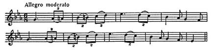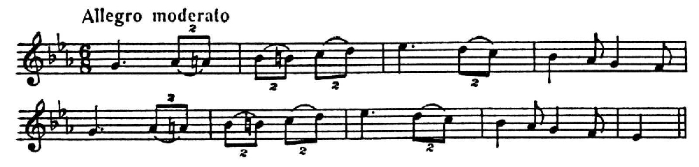 Например, триоль из восьмых нот по временнуй протяжённости равна двум восьмым основного деления, или одной четверти; квинтоль из шестнадцатых — четырём шестнадцатым основного деления, или одной четверти. В произвольном Р. д. трёхдольных длительностей дробные доли в некоторых случаях длиннее основных долей, например: две дуольные восьмые равны трём восьмым основного деления и т. п. (см. примеры). В ритмические группы произвольного деления могут входить паузы, равные по длительности замещаемым ими дробным долям, напр.: