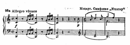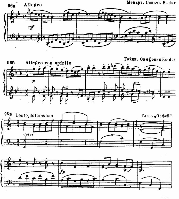 Интонационное содержание, в особенности в темах сонатного allegro, нередко непосредственно связано с мелодическими оборотами оперных арий. Даже структура тематизма часто основывается на «диалоге» между героически-суровыми и женственными скорбными образами, отражающими типичный (для классицистской трагедии и для глюковской оперы) конфликт между «роком и человеком». Например: