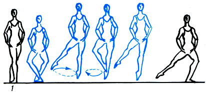 ROND DE JAMBE (рон-де жамб, франц. — круг ногой), круговое движение работающей ноги en dehors и en dedans. Имеются разновидности: R. de j., выполняемый носком по полу (par terre) на высоте 45° и 90° (en l’air), a также с броском на 90° (grand R.de j. jete). R. de j. тренирует подвижность ног в тазобедренном суставе. R.de j. en l’air — круговое движение нижней части ноги при фиксированном бедре, отведённом в сторону на высоту 45° (или 90°), развивает подвижность коленного сустава. R.de j. en l’air saute исполняется с прыжком.