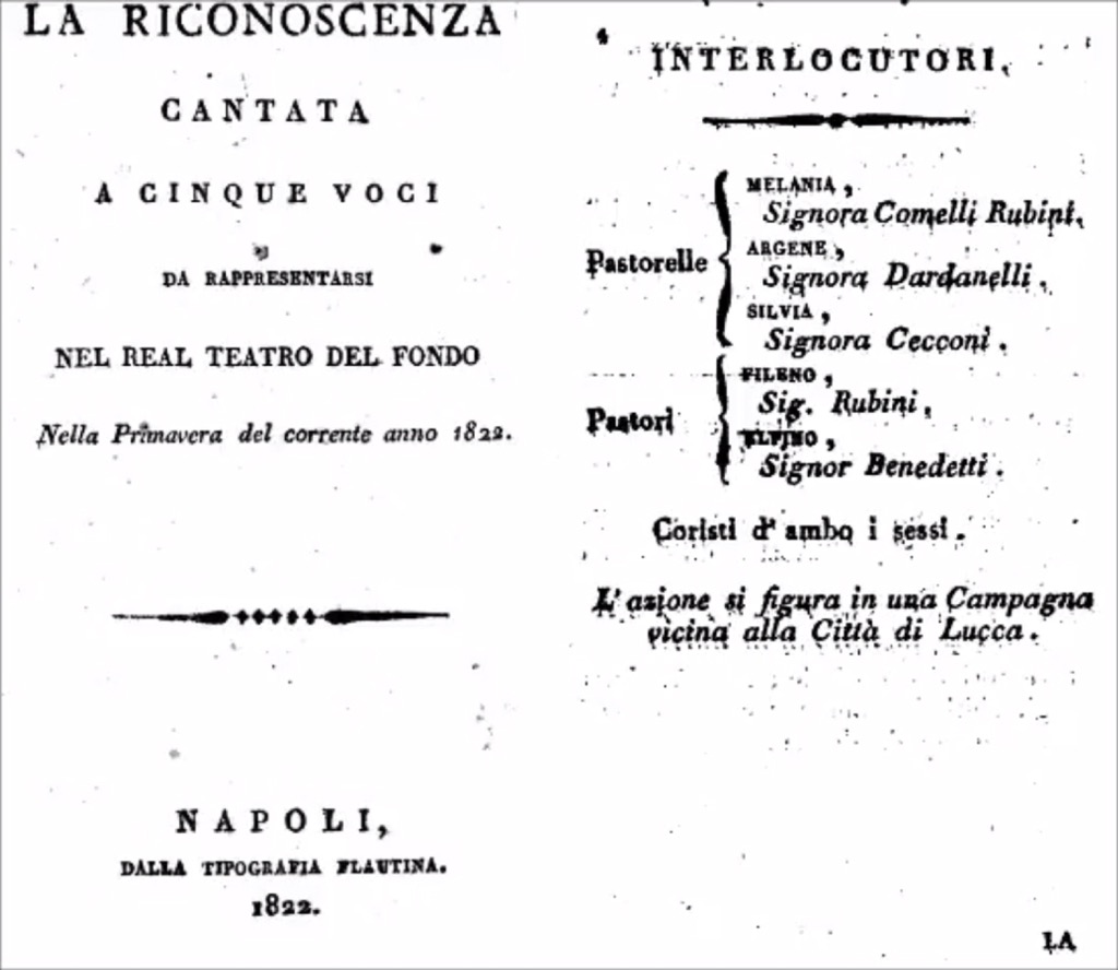 Любопытно также, что в партиях Мелании, Арджене, Филено и Эльпино в этой программе значатся те же певцы, что принимали участие в первом публичном исполнении кантаты в театре «Сан-Карло» 27 декабря 1821 года. Одна лишь ремарка: Аделаида Комелли названа теперь «синьорой Комелли Рубини». Но сие неудивительно, ведь эта хорошо известная в свое время франко-итальянская певица (настоящая фамилия, под которой она выступала во Франции, – Шомель) в 1819 году вышла замуж за знаменитого итальянского тенора Джованни Баттисту Рубини. В частности, в Италии она исполнила партию-травести Кальбо на премьере оперы Россини «Магомет Второй» (Неаполь, театр «Сан-Карло», 3 декабря 1820 года).