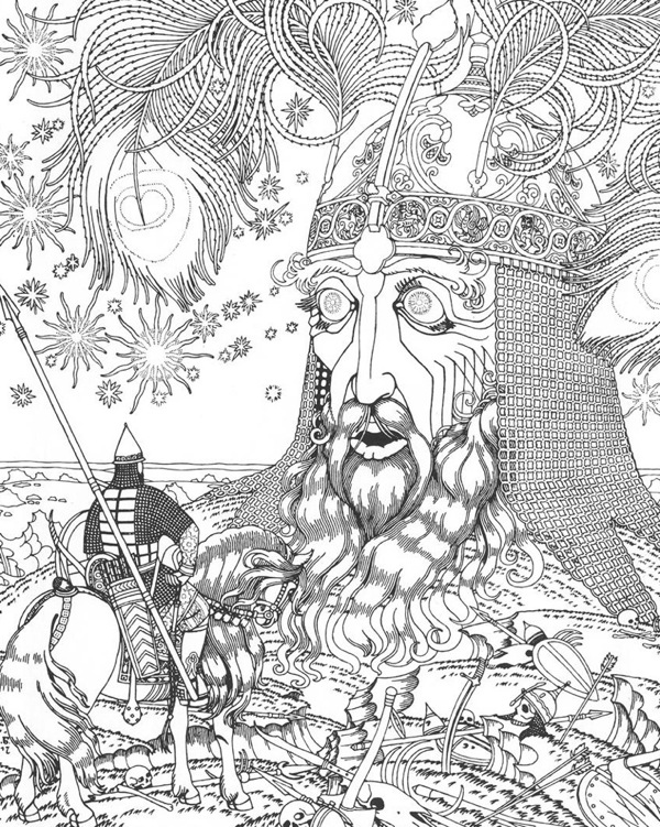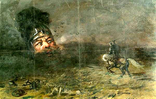 Картина 3. Все дальше уходит Руслан в поисках Людмилы. Вот он оказывается на поле старой битвы. Все окутано туманом. Все поле усыпано костями. Руслан вопрошает: «О поле, поле, / Кто тебя усеял мертвыми костями?» Среди всех этих следов давней битвы Руслан ищет богатырский меч, который был бы по нему. Но все, что ему попадается, не то. Туман рассеивается. Вдали видна громадная Голова. Она обращается к Руслану: «Кто здесь блуждает?». Голова гонит пришельца, чтобы он не тревожил «тлеющих витязей сон непробудный». Но Руслан не думает уходить. Тогда Голова дует навстречу Руслану; поднимается буря. Витязь в гневе поражает Голову копьем. Голова отшатывается, и тогда обнаруживается меч, который она хранила. И вот Голова рассказывает историю этого меча. Когда-то их было два брата, великан и карлик (Черномор), вся сила которого заключена была в его бороде. В чудесном замке хранился волшебный меч-кладенец. Обоим братьям он грозил смертью. Каждый из братьев хотел сохранить меч у себя. Хитростью коварный карлик отрубил голову великану, и она улетела в эту пустыню и погребла под собой меч. Теперь «Меч сей чудесный / Злобе коварной / Положит конец!» — восклицает Руслан, поняв, что злой карлик, Черномор, и есть его оскорбитель, о котором ему рассказал Финн.