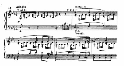 В инструментовке Adagio чувствуется интимность и камерность. Моментами оркестр напоминает гигантский струнный квартет. Иногда кажется, что господствующий аккордовый фон можно передать звучанием фортепиано.