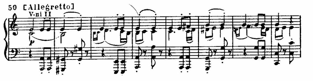 Примечателен здесь и другой важнейший выразительный элемент — «шорох» струнных, постепенно разрастающийся до оркестрового fortissimo. Из этого фона, путем на редкость изобретательного преобразования тематизма, рождается главная тема первой части: она как бы вырастает из звука ми, которым завершается развитие вступления и который играет роль «соединительной интонации» внутри всего цикла (этот же звук будет обыгрываться композитором и в теме Allegretto и в главной теме финала):