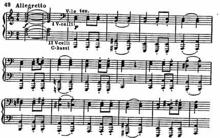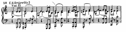 Главная тема Allegretto, похожая на немецкую народную песню, поражает своей простотой. Ее мелодия, неизменно возвращающаяся к звуку ми, который встречается в тематизме других частей, ее неуклонно повторяемый ритм создают впечатление внутренней скованности, неумолимости. Но в средних голосах уже заложен контрастный элемент движения: