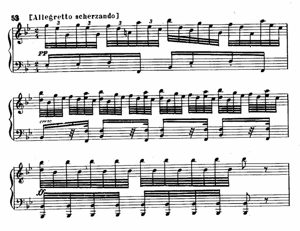 Обращает на себя внимание и сходство этой музыки со второй частью «Лондонской симфонии» D-dur Гайдна, где композитор подражал непрекращающемуся равномерному тиканию часов. Острый юмористический эффект достигается в самом конце, где господствующее во всем Allegretto оркестровое pianissimo в последнем такте вдруг переходит в резкое fortissimo: