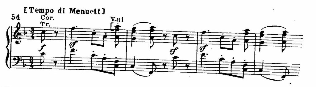 Неожиданным контрастом к менуэту является трио — единственный лирический эпизод во всей симфонии. Это — подлинное старинное трио, где солируют три инструмента. Нечто моцартовское слышится в его прелестной мелодии и тонкой гармонии. Тем резче выступает пышная звучность обрамляющего его менуэта.