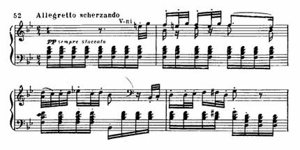 В восьмой симфонии нет лирической части. Ее вторая, скерцозная часть, Allegretto scherzando (Форма Allegretto – соната без разработки.) – тонкая пародия на точную размеренную ритмику раннекласицистской музыки. В основе мелодического движения лежит ритм маятника, механически неотступно отбивающего такт. Главная тема Allegretto позже стала темой шуточного канона, сочиненного Бетховеном в честь изобретателя метронома Мельцеля: