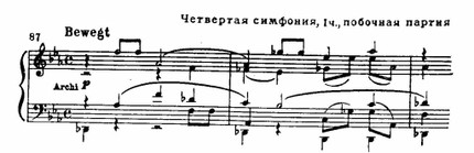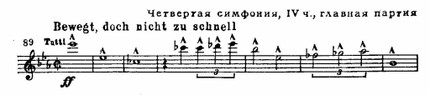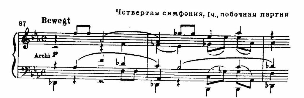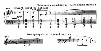 Широко представлена третья тематическая группа, где на большом динамическом нагнетании, при неизменном тремоло струнных, разрабатываются контрапунктические мотивы главной темы (см. пример 86 б).