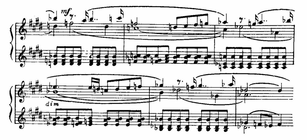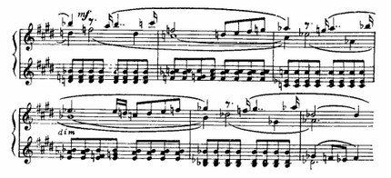 Ее извилистый склад вызывает смену красочных гармоний, находящихся в терцовом соотношении (h—G—B(F)—As(Es)—Ges). Песенность предшествующих партий дополняется танцевальностью третьей тематической группы. Сделано это очень изобретательно: огромное динамическое нарастание на органном пункте fis внезапно срывается и будто издали возникает угловатый, несколько загадочный мотив: