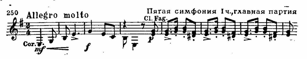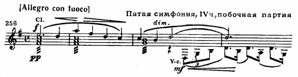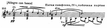 Но неожиданно (перед «трио»), драматизируя содержание части, вторгается резко изломанный, словно искаженный душевной болью «лейтмотив». Образы борьбы возникают и в коде, предвосхищая торжественной фанфарой труб победный итог всей симфонии.