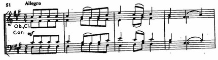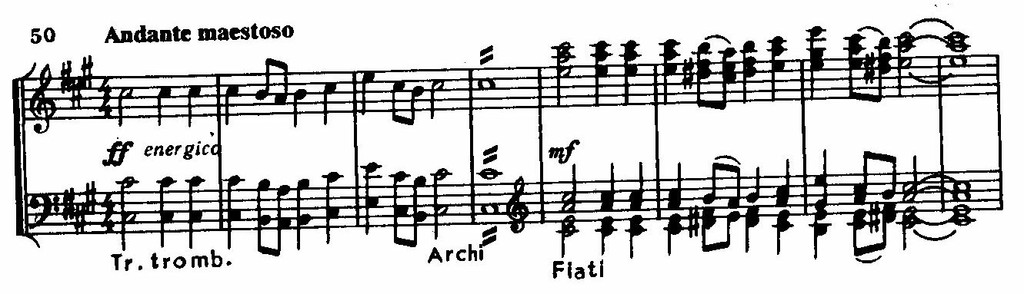 В главной партии первой части сохраняются общие мелодические очертания и интервалика приведенной темы, но изменение метра, темпа и фактуры превращает величавый «истовый» напев в подобие тяжеловесной неуклюжей пляски.
