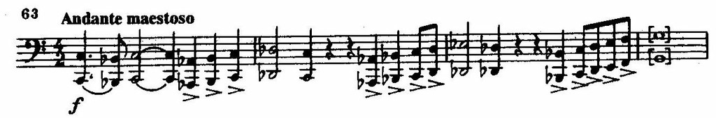 Разработка заменена последовательным рядом варьированных проведений первой, затем второй темы. В репризе обе темы проходят в ритмическом увеличении со смещением акцентов, что придает им особенно внушительный и величавый характер, и наконец, в коде разные их варианты соединяются контрапунктически, как бы сливаясь воедино.