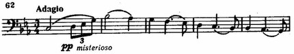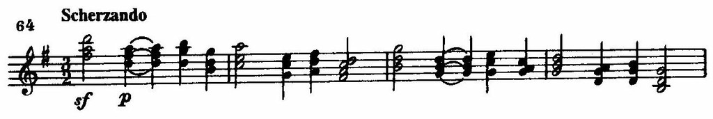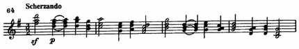 Тема побочной партии, контрастируя ей своим легким скерцозным характером, одновременно содержит известное ритмическое сходство с первой темой и может рассматриваться как производная от нее.