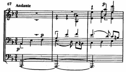 Andante построено на трех темах, изложение которых представляет некоторую аналогию сонатной экспозиции. Первая торжественно-величавая тема, исполняемая медными духовыми с частичной поддержкой деревянных, заключена в рамки законченного восьмитактового построения,
