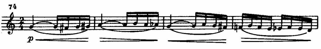 Резкий контраст вносит стремительное Скерцо с двумя темами: одна извивающаяся, «змеевидная», кружащаяся как волчок (источником этой темы служат грозные вступительные тираты предшествующего Mesto),