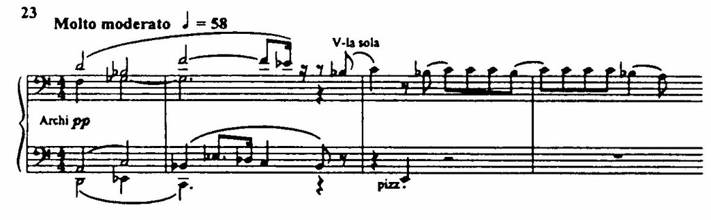 Во второй части (Adagio mesto) привлекают внимание черты пассакальи, наиболее явственные в крайних ее разделах. Жанр пассакальи и ее образная сфера — остинатные аккорды начала, создающие образ скорбного шествия, горестный мелодический речитатив виолончелей («монолог-исповедь», как пишет Б. М. Ярустовский), мучительная кричащая кульминация — вызывают аналогии с симфониями Шостаковича.